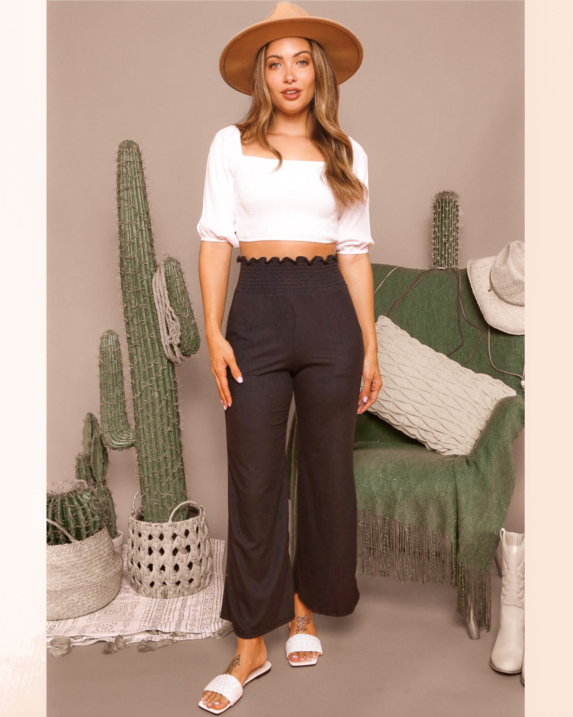Smocked Waist Rib Knit Wide Leg Pants w/ Pockets